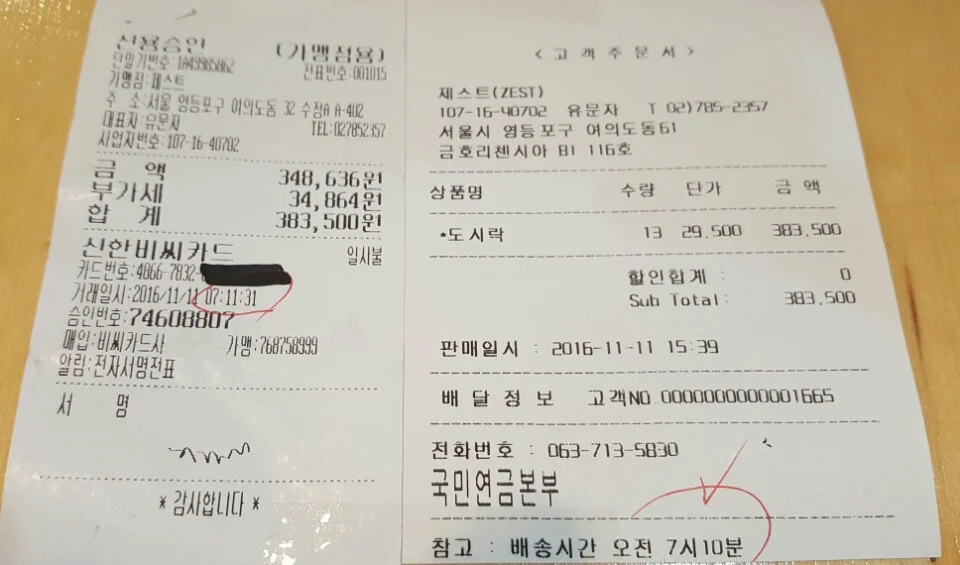 오늘은 새벽부터 도시락을 준비하느라 분주했습니다. 아침식사 도시락 주문이 있었거든요. 오전 7시20분전까지 꼭 시간 엄수해 달라고 신신 당부하셔서 저희는 그냥 애초부터 7시10분이라고 주문서에 기록하고 주방식구들과 함께 움직였습니다. 결제 영수증 시간을 확인해 보시면 시간을 지켜드린점 보이시나요?