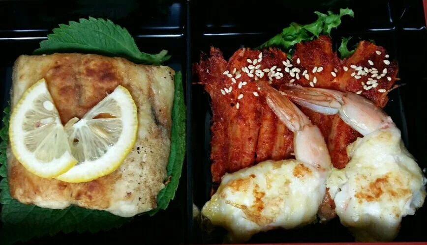 생선구이와 새우전, 더덕 꼬지입니다.